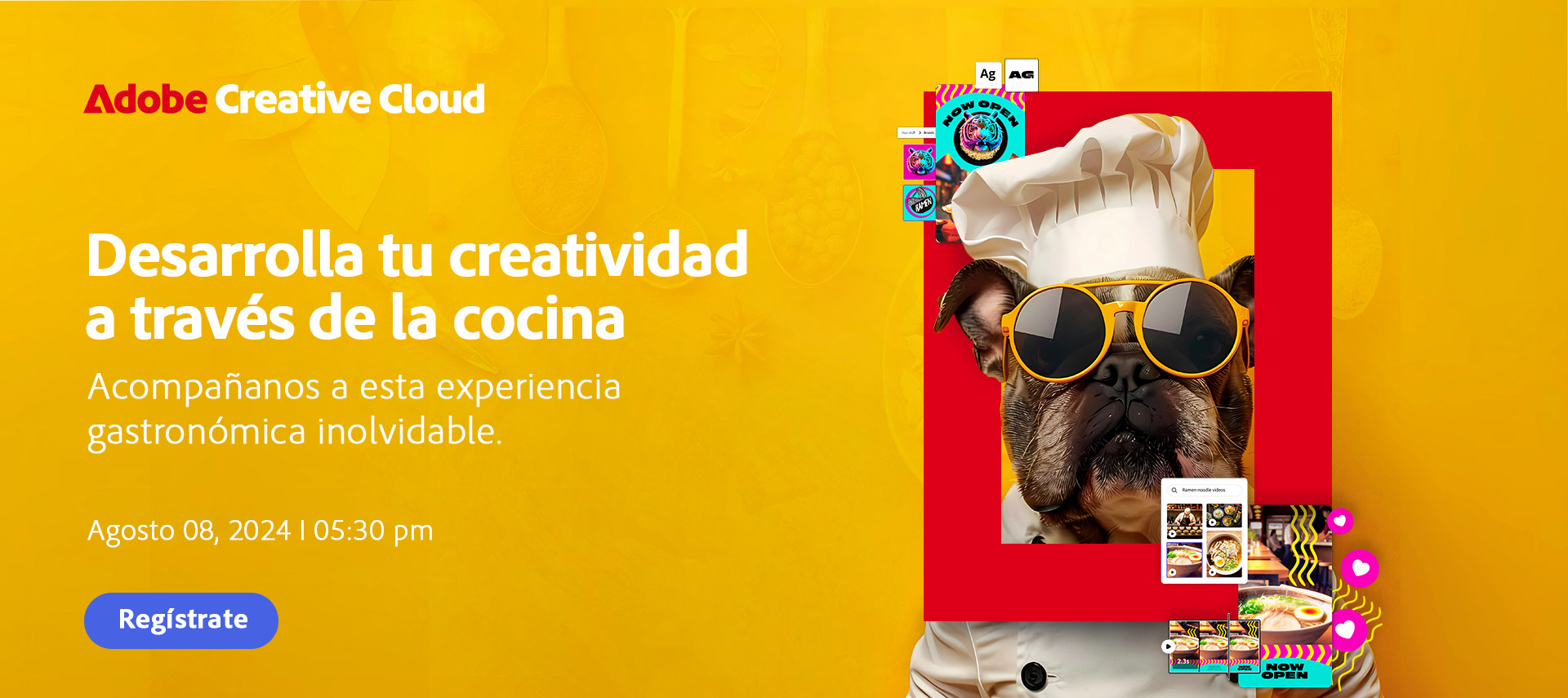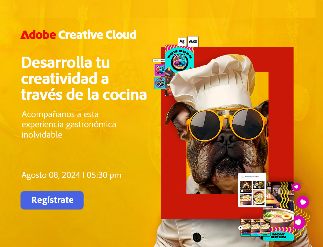 Toma unos breves minutos para realizar el registro al evento “Desarrolla tu creatividad a través de la cocina con Document Cloud y Creative Cloud: Firefly y Adobe Express”