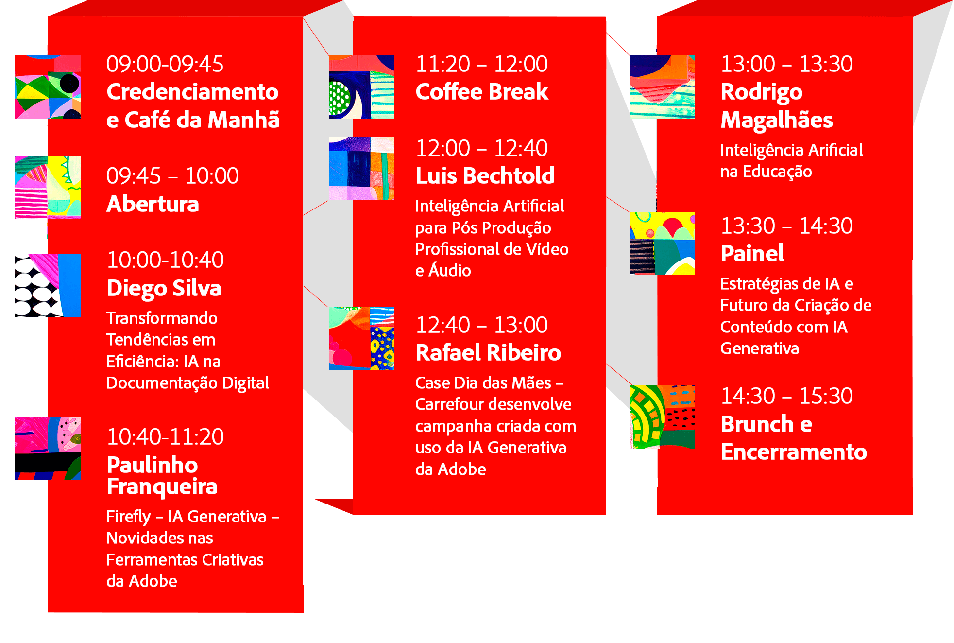 Criamos o espaço ideal para explorar as últimas tendências e inovações em Criatividade e produtividade para sua empresa. Ao longo deste evento, aprofundaremos em aspectos-chave que impactam diretamente sua indústria, oferecendo ferramentas e conhecimentos práticos que você poderá aplicar no seu dia a dia. A seguir, apresentamos o programa que guiará nosso percurso: